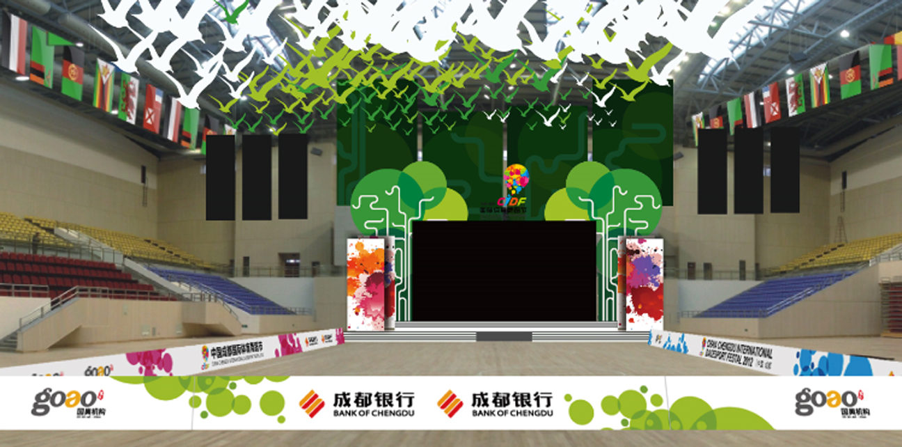 中国成都国际体育舞蹈节是中国举办的首个国际体育舞蹈节,在成都市双流体育中心举办。 为国际体育舞蹈节提供了场景设计服务,运用专业的品牌理念为客户进行品牌服务,有效提升其文体娱媒中的品牌价值。